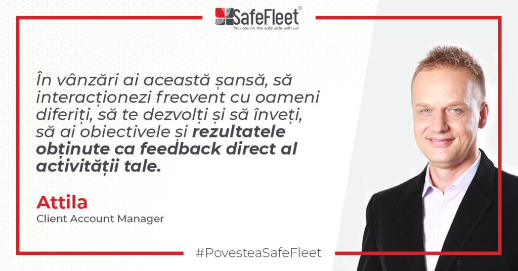 Orientat către rezultate, Attila ocupă cu mândrie postul de Client Account Manager la SafeFleet. Totodată, consideră domeniul vânzărilor unul dinamic unde singura constantă este “schimbarea”. Povestea lui la SafeFleet îi aduce motivația de care avea nevoie și se bucură de suportul colegilor în activitatea lui.