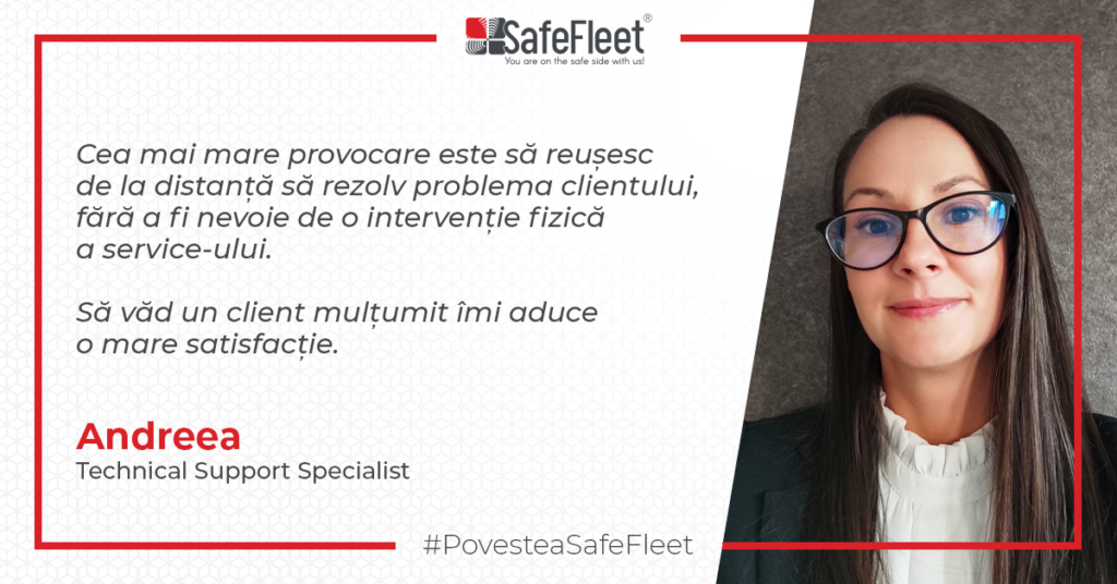 Cu o pasiune pentru gătit și pictat, dar și cu valoroase cunoștințe în domeniul vânzărilor și a suportului tehnic, Andreea ne încântă încă din 2018, atunci când a pășit pentru prima dată în echipa SafeFleet. În prezent ocupă postul de Technical Support Specialist, iar stabilitatea locului de muncă, recunoașterea performanțelor, atmosfera plăcută și colegii îi mențin motivația la cote înalte.
