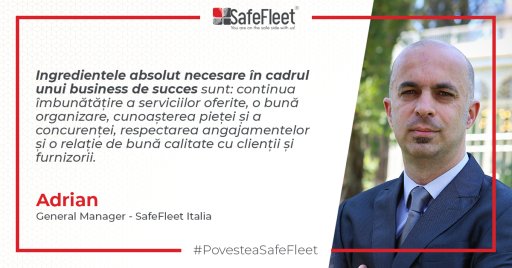 Încă de la început, Adrian a văzut plecarea lui în Italia ca pe o oportunitate de explorare a unei realități diferite și de lărgire a orizontului. Un mindset de creștere l-a ajutat și în introducerea brandului SafeFleet pe piața din Italia. Astfel, ajuns în rolul de General Manager pentru SafeFleet Italia încă din 2009, poate spune că a crescut împreună cu compania. În același timp, Adrian reușește să mențină un bun work-life balance, făcându-și timp și pentru pasiuni, cum ar fi: sportul, fotografia, muzica și nu numai.