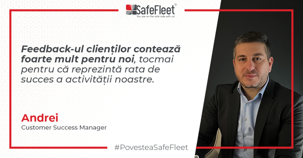 Andrei ocupă rolul de Customer Success Manager la SafeFleet, iar datorită experienței acumulate, coordonează și echipa de suport. Iar pentru el activitatea de suport este una dinamică, plină de provocări și îi place că întotdeauna are ce învăța.