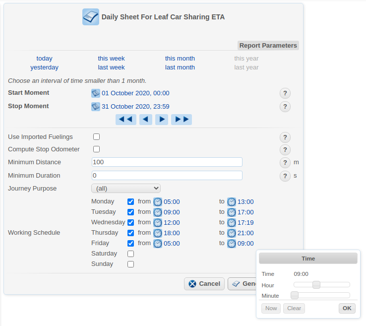 Pentru rapoartele „Foaie de activitate zilnică” și „Ore de condus” a fost activat un filtru nou care poate fi setat la configurarea celor două rapoarte și care evidențiază doar informațiile din cadrul programului de lucru: