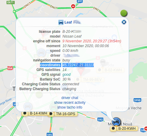 La click pe vehicul în pagina de Poziții Curente, sunt afișate acum în pop-up și coordonatele GPS pentru locația curentă a vehiculului.