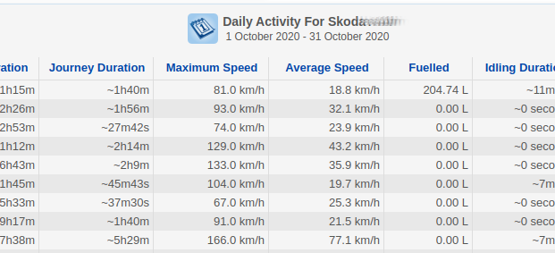 Raportul Activitate Zilnică are acum trei coloane noi: viteză maximă și viteză medie, precum și total litri de combustibil alimentați.